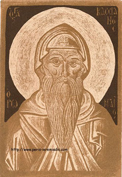 Quelques Saints (prophètes, anges, etc.) dessinés pour l'ouvrage «Le Synaxaire – Vies des Saints de l’Eglise Orthodoxe» (*), publié en 12 tomes par les Editions Indiktos en 2006. Ces portraits ont été réalisés selon la technique du "grattage" (terre et encre noire) sur des planches de bois. Ils révèlent une grande connaissance de l'histoire des icônes et de celle du portrait et s'appuient sur un important travail de documentation (représentations traditionnelles des Saints) ainsi que sur une étude approfondie menée depuis les années 1970 sur ce thème. Il emprunte à cette tradition (posture, traits, regards de l'éternité, symboles) tout en respectant sa démarche picturale singulière.